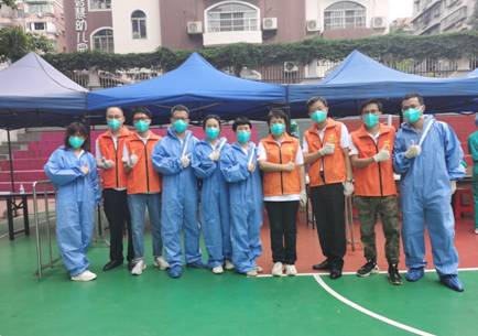 周遜姜同志(右四)帶領廣紡聯(lián)志愿者在核酸檢測現(xiàn)場
